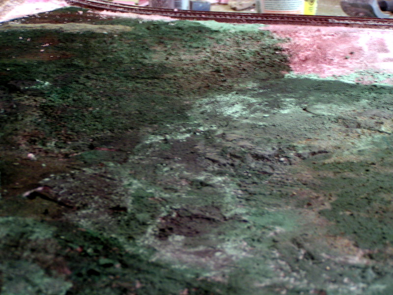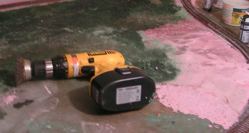 . By using a wire brush in my drill at moderate R P M i not only made the hills but made the foam rough enough that all it required was paint to look like grass no messing around with colored ground foam. I used a stencil brush to apply the paint laying down a base color and coming back hitting the tips of the "grass" with another shade of green or brown. If i didn't like the way an area came out i'd take it down a bit with 100 grit. Other places i hit with a wire dog combing brush for row effect, a file brush would work also. Some places the drill got away from me and i left a gouge which ended up as a gray rock outcropping.