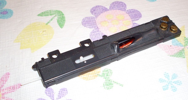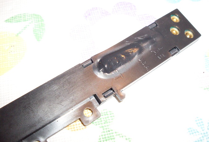 It's completely melted a hole in the top, and it's sagging through the bottom. I'm sure I hadn't even operated that switch the night before, because it's on a siding where I park my passenger train. After I took the switch machine off and made sure the wires were secured and separated, I pushed the switch lever a couple times. I noticed that the power light on the transformer flickered as if a switch was attached, but nothing was attached to it. I'm thinking the lever is bad, maybe sticking or something.