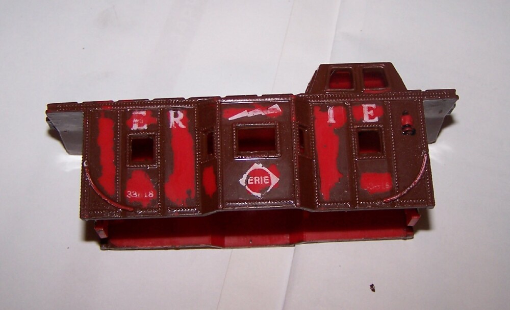 It's an Erie , # 33618 . My wife has my SD card USB reader, so I can't post a pic yet. I soaked it for 12 hours in Simple Green, and it softened the paint enough to remove some of it with a paper towel. Unfortunately the stock white lettering underneath was also affected, so it's coming off some,too. It looks rather hideous with the brown and red, but I might leave it like that, like a rusty caboose with paint peeling off it, rust oozing everywhere. Ick! I'll post a pic of it as soon as I can. I tried searching "The Internet", but came up empty on any pic of it. Must be a scarce model!