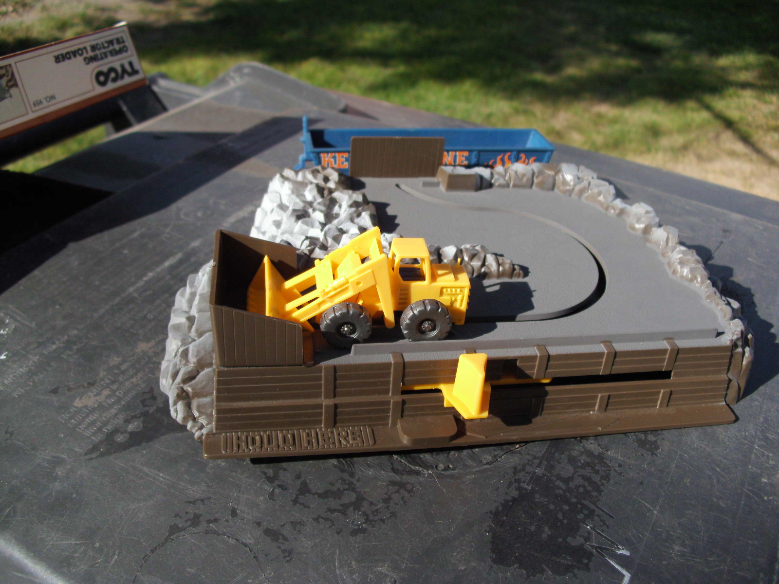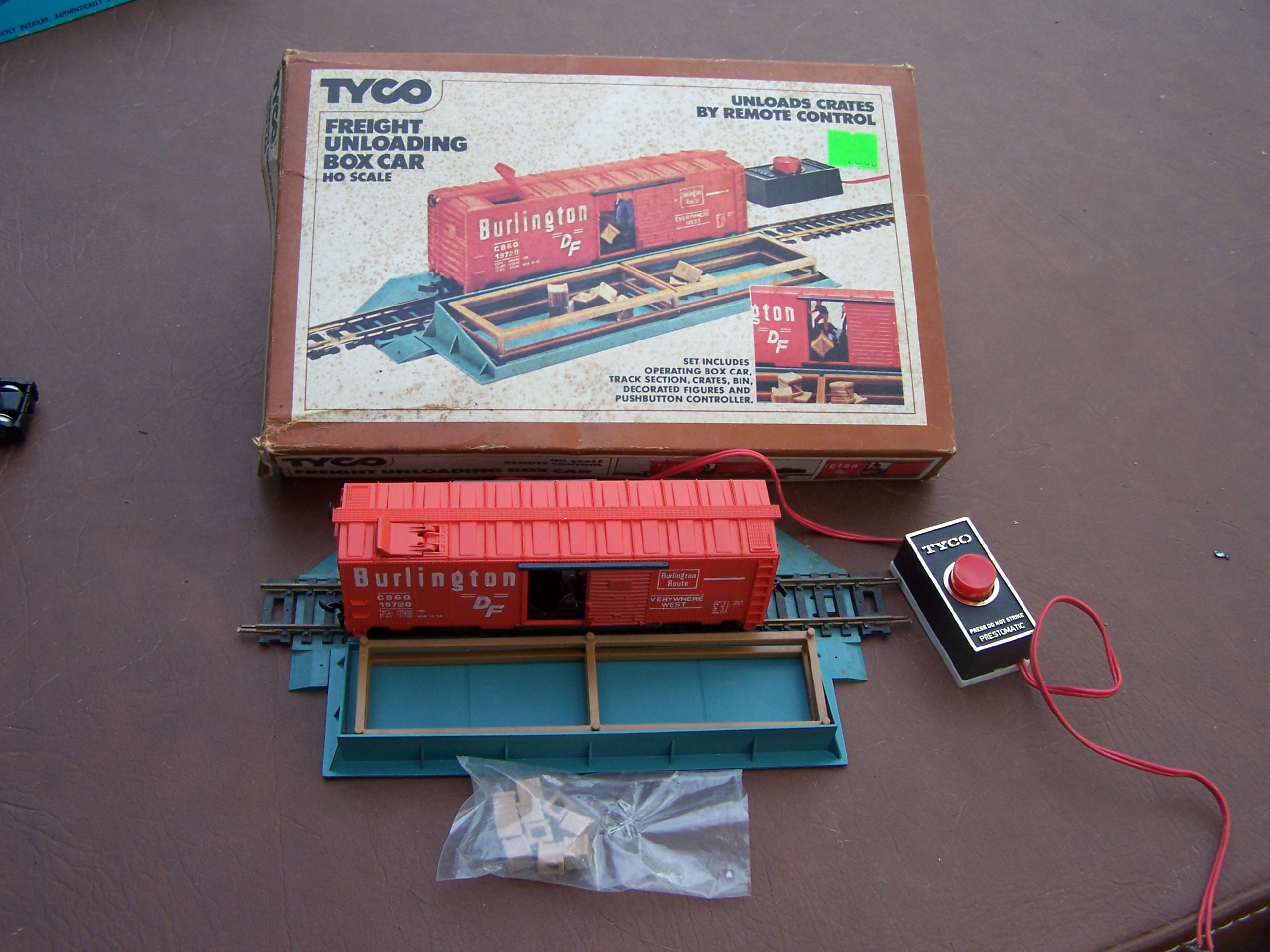 I visited the last model train hobby shop near me today, actually for some Tomy AFX slot car track, and they had some good vintage HO stuff on hand. I bought a few pieces, a Bev-Bevel NW Observation car, some modern Marklin 3-rail track, and a Tyco score, a boxcar unloading set, complete, for $10. Box has some mold stains, but finding the whole set intact was great. I have 2 of the boxcars already, but none of the platforms or actual crates that were with the set. Here's the set now :