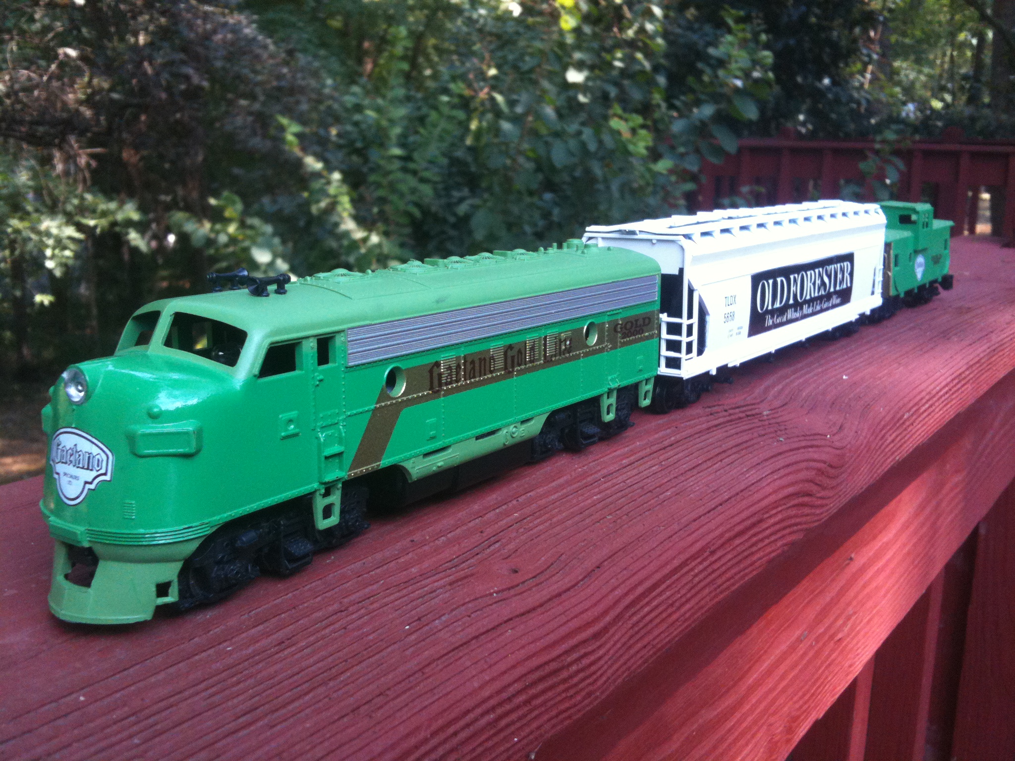 Rare special run Gaetano F7A and widevision caboose bracketing the rare Old Forester ACF hopper car
