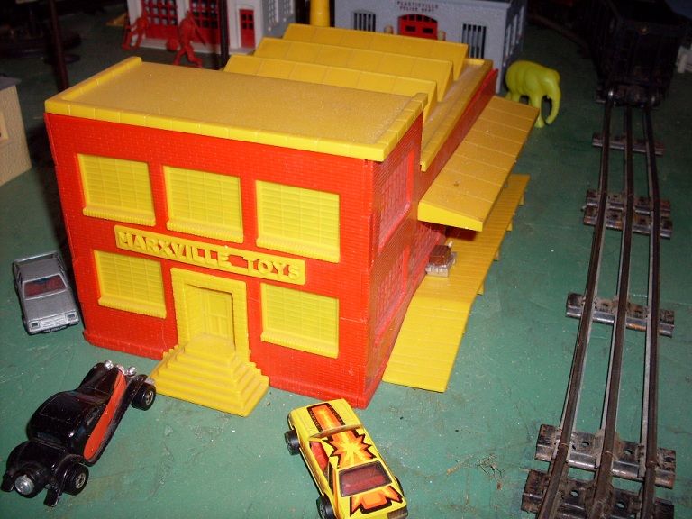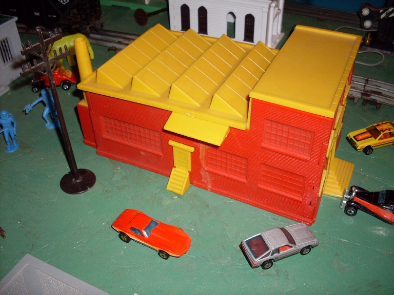 I hope nobody minds, but for my BOTW I'm going to step away from HO to the O/O27 world. Here's a Marxville Toys factory that I've had for a while. I've always liked it--it's just a fun addition to our totally non-serious Lionel setup. You can't tell in the pictures, but the windows have pictures carved in them. I think if I lit it up it would have a silhouette effect.