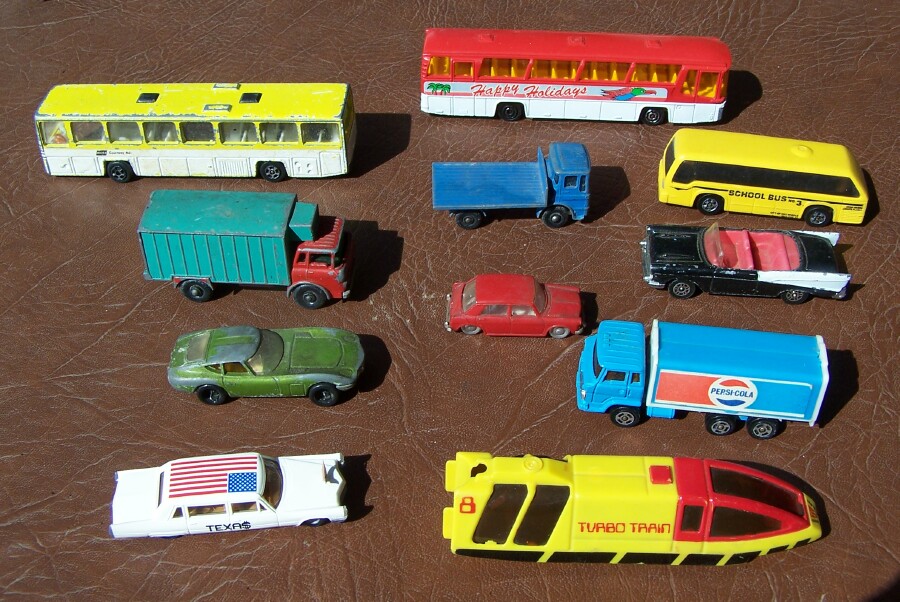Ow! Ow! I hurt ENOUGH already! The yellow and white bus is a Playart, the other a Majorette. I'm starting to collect Playarts ( trains included, yes ), and this is my first bus I found. Missing the doors on the other side, though. But I will use it for an airport tour bus, so won't need doors. :) Yes, Arlin should have the M...but the vendor didn't have it with him. They're common enough to find, apparently. I just wanted the fish. That's my 2nd Thrill show caboose, I intend to make an AMC train consist with it ( there used to be a real Thrill show with AMC Javelins, which is what I"ll base this set on ). So I'll be looking for more of those cabooses as the sleeper cars between boxcars for hauling the cars in.