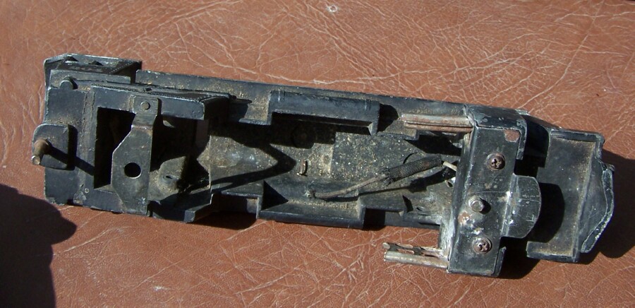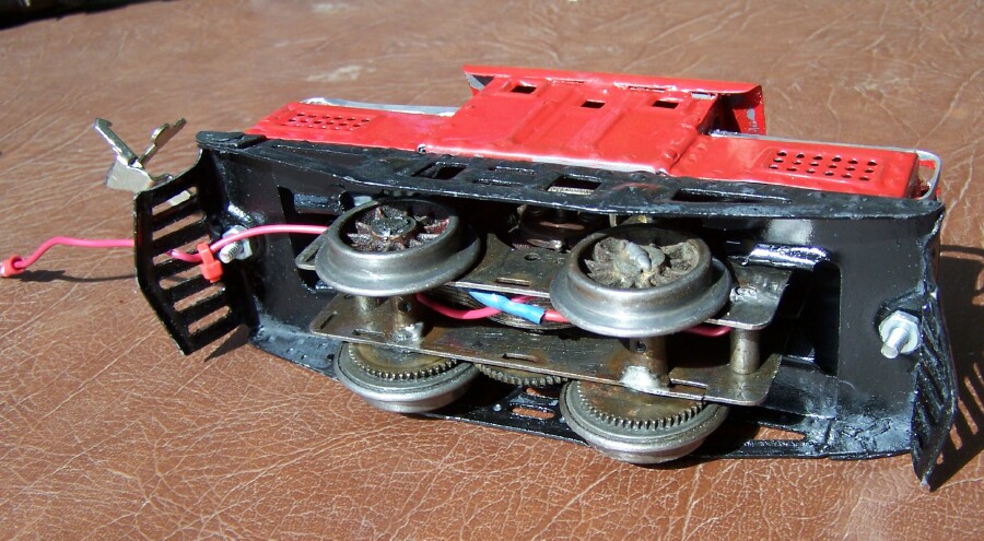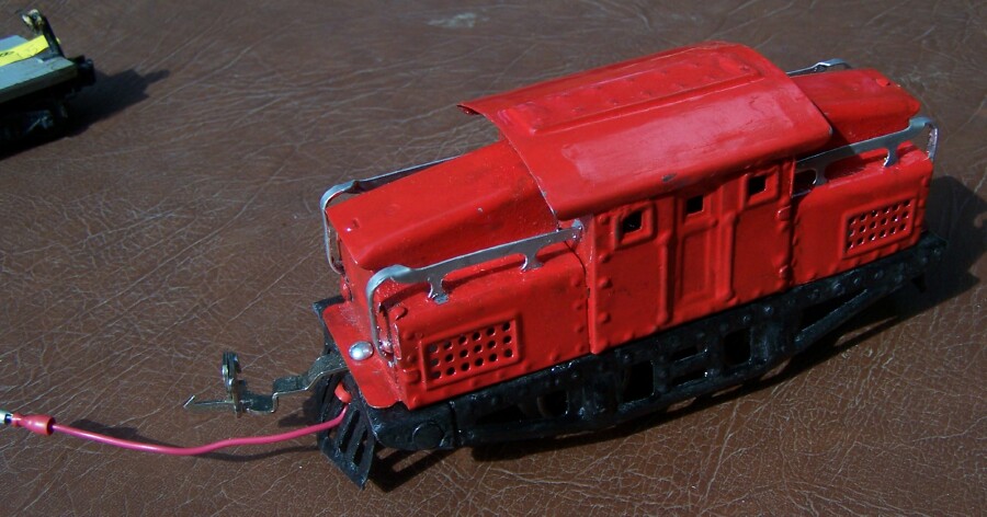Next, the red engine, for $20, I think the guy said it was American Flyer, but the wheel spacing is the same, or close by fractions, to the Lionel searchlight car. I thought the spacing wasn't that close between S and O. Anyway, if anyone knows what it might be, let me know -