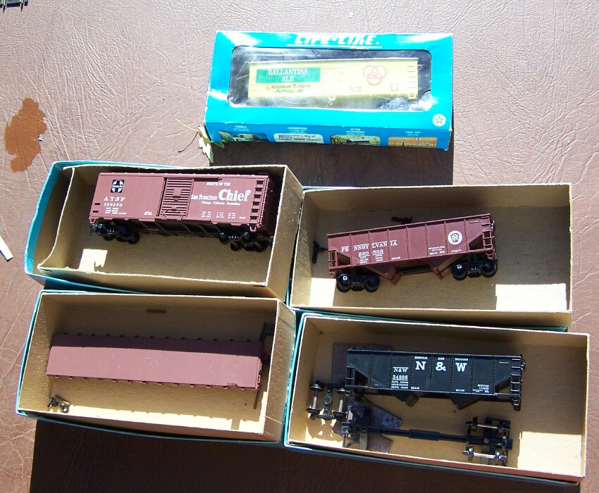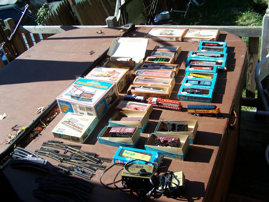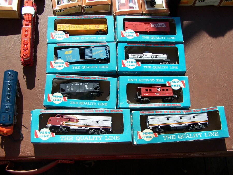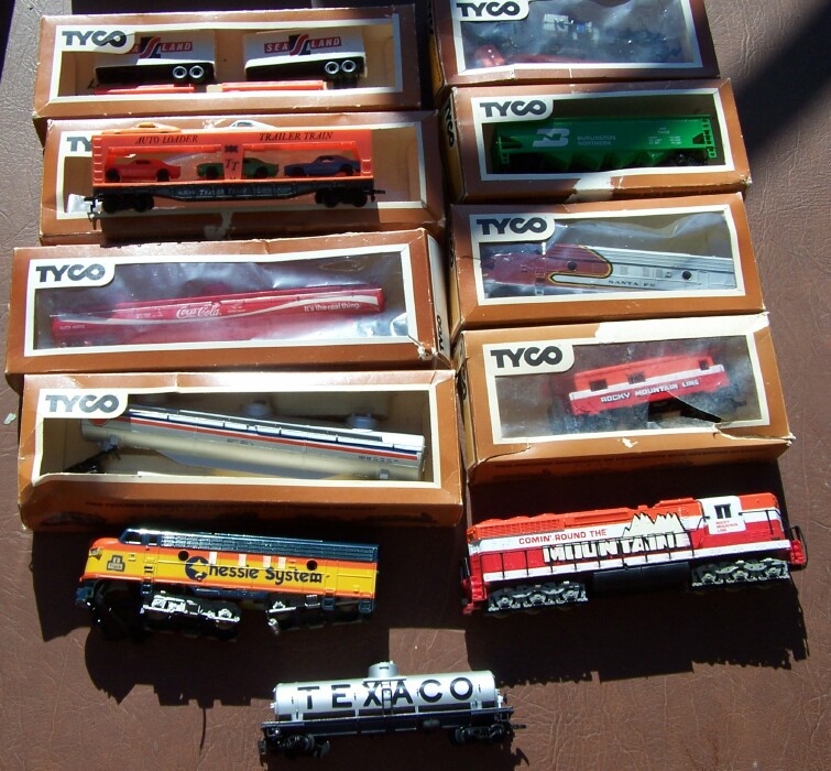 While checking out toys and antiques in the Craigslist listings,I ran across an ad for a box of Tyco and other makes trains. So I emailed, and today I stopped on the way home to check it out. He'd sold another box already, this one had half Tyco and half Penn Line cars, with a Life Like thrown in. Had Accessories as well ( cattle station, others, I'll do pics and stuff tomorrow ). He had two Tyco diesels, a Chessie 4015 Tyco, and a Coming Round the Mountain diesel ( trucks had both metal wheel sets on same side, so I imagine they couldn't get it to run. LOL ). Chessie didn't respond to battery power, either. I offered 50, he countered with 75, I went to 60 and no more, and he sold it to me. Not a great bargain, but with the amount of stuff there, I think it was a reasonable amount. The cattle loading accessory had both the truck AND the cattle there. :) The 3-axle Coke tanker is nice and complete, the 3-axle Gulf tanker has both trucks with broken tabs on the pins, so it'll need repairs. The Life Life Ballantine wine car is wild, a glow-in-the-dark yellow-green color with silver roof. The Penn Line N&W hopper had it's zinc weight expanding and cracking, it had bent out and cracked both sides at the middle area. I removed the weight to relieve the stress. Other Tycos include the Autoloader, a BN green hopper, the matching caboose for the Mountain diesel, and others. I left most out in the car so the wife wouldn't see them yet. While she's out running morning errands, I'll bring them in and get them photo'd for the Forum. I like the old Penn Line cars, these came with correct boxes, too. So while not a huge bargain, it's still a pretty good deal for the number of items I got. At 3-5 dollar per car show pricing, I did better than that I think. I'll sort thru the accessories to see what's missing if anything. No McD's or KFC's or anything rare, I don't think ( I looked ). Never know what's in the bottom of the box, though. Some brass and steel track, a transformer, and who knows what else yet. Well, a long day, time for an early bedtime. Look for photos here in the Craigslist post either Friday or Saturday.