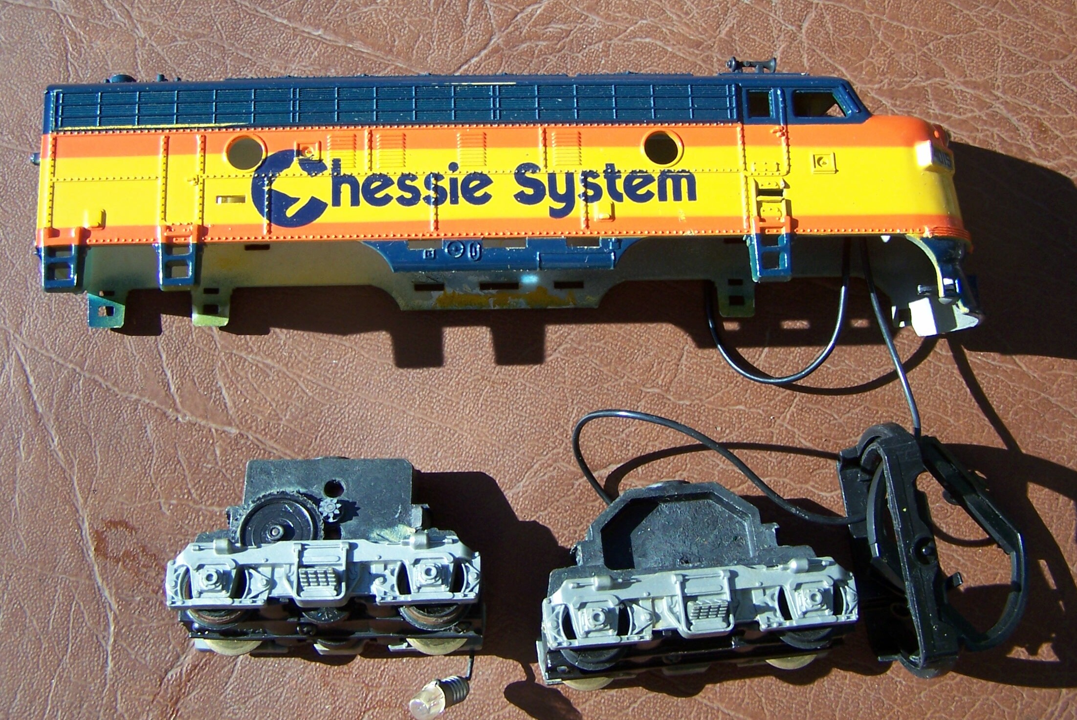 Well, I took apart the Rocky Mountain engine to see why it wouldn't run ( the light DID light, but no power to wheels ), and found a broken wire to this motor, much like the Chessie before. Lightbulb wire was working, though. When I touched power to the motor contacts, it screamed like a mouse getting it's crotch kicked, so I think it needs a bit of lube as well. And looking at it, I'll have to move the axles in the non-powered end, not the motor end. No biggie. I doubt either engine ever ran much on the track, considering the problems they both have. They both look almost brand new. Amazing.