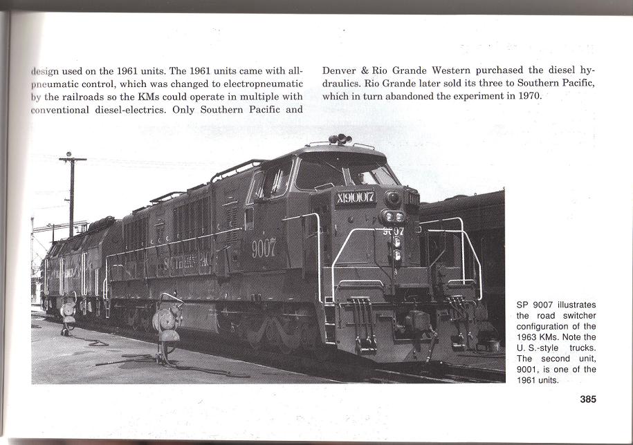 Shaygetz, I've got the same reaction. These were cool cab units... KM is a German concern that is still in business. I believe they had a Voith transmission. Pity they did not take to our North American operational requirements. The Krauss-Maffei Diesel-Hydraulic experiment that Rio Grande and SP took on was more short-lived than UP's turbines, but I think it is amazing that Diesel-Hydraulics are used as shunting locomotives on the continent and in the UK considering the complexity of the drive systems. Here's a link for an SP hood unit variant of the KM cab: http://www.northeast.railfan.net/images/sp9006.jpgWow; what's next in this post? Anybody fancy Diesel-Mechanical shunters? Cheers, Lee