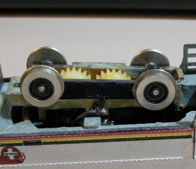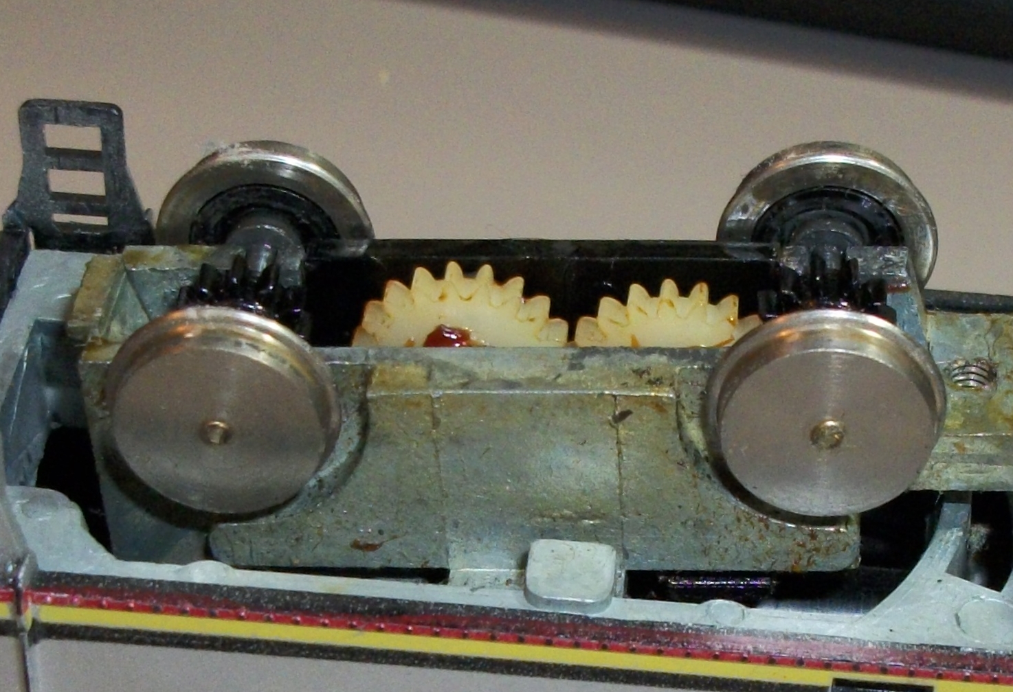 Here are some close up side shots. These are 2 piece wheel sets, one wheel will slide off and the gear slides on. A solid one piece wheels set would work as long as the gears mesh ok. Just a shame to see such a smooth running AB set side lined.