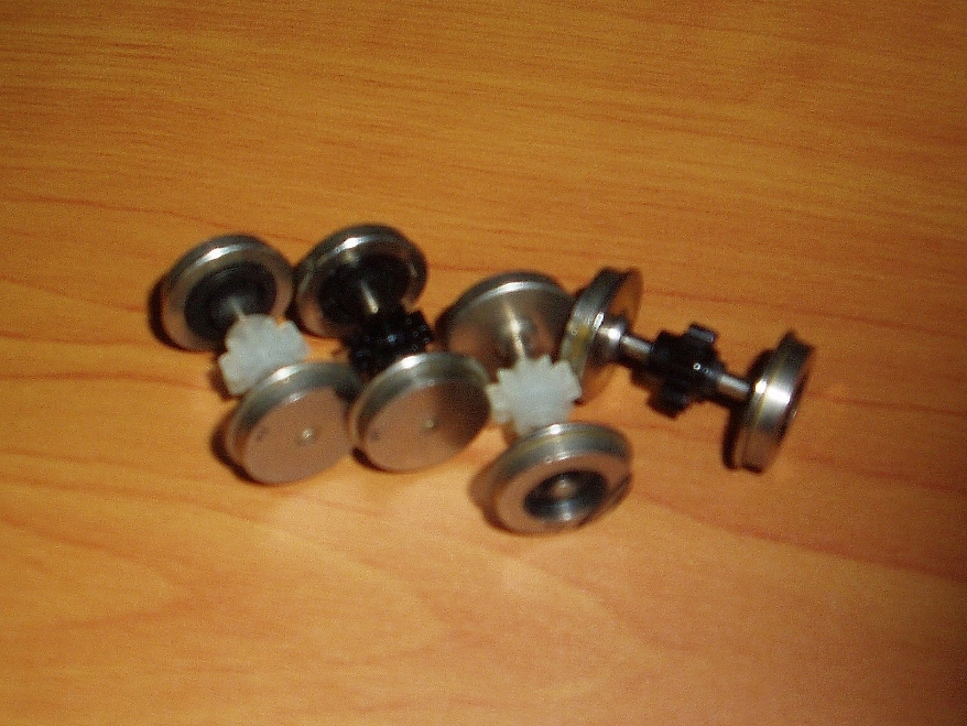 Can you get a better side shot of those wheels? All the ones I have are smooth, yours look like they almost have spokes in the middle. Can't tell from the photo. Not sure if the ones I have are Roco or someone else's, but I have an eclectic collection of geared axles I got from my junkbox buddy. Some of the gears don't have extensions on either side, looks like your's do, so your axles may not be 1-piece, but two. I'll look to see if I can find anything that looks like yours, but so far, haven't found any.