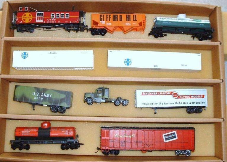 I've been wanting to get one of those HO Cox R/C flying models trucks, but they seem to sell very high on Ebay. While trolling generic box lots on Ebay, I found two that had stuff I wanted, and one had the Cox R/C trailer, both lots starting at $8 for about 8-9 items each lot. I won both lots today for the minimum! Sometimes it pays to search the lots seller by seller. Here's a pic of what I got :