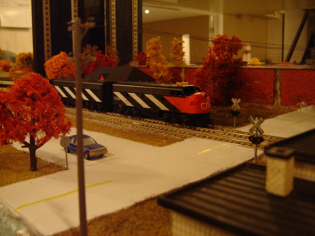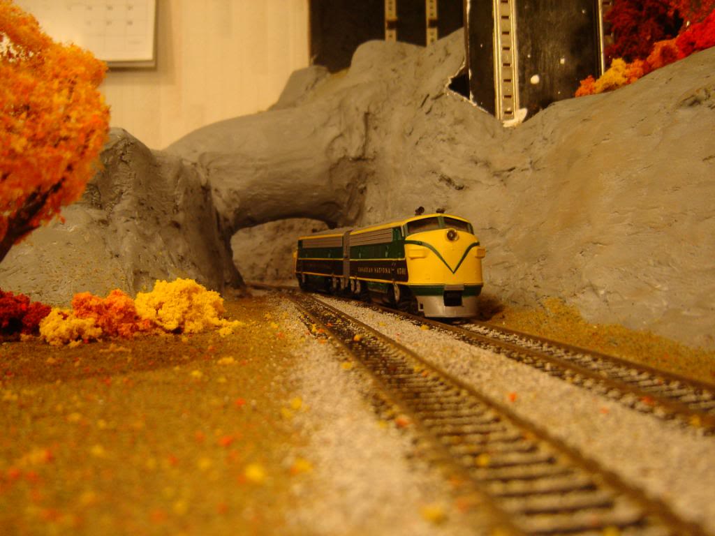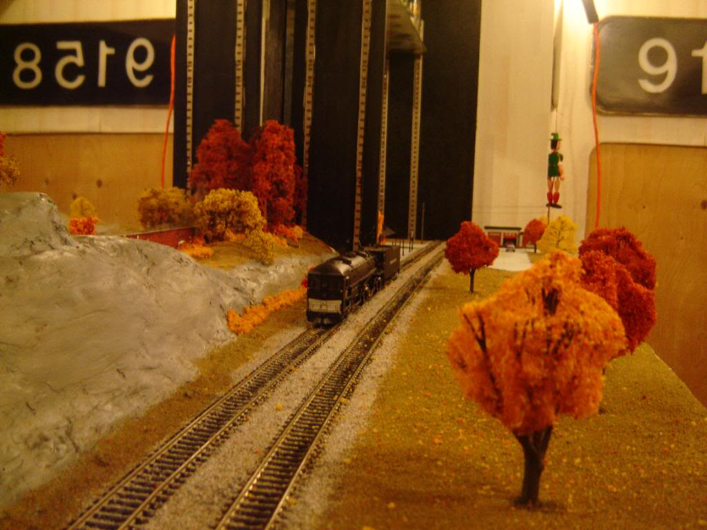Thanks! The fall colours actually aren't hard at all. It's just like summer scenery but with dry grass, and colourful trees/shrubs. The leaves on the ground were a complete accident Woodland Scenics sells this foliage that you pull appart to fit where you need it (it's the same stuff they stretch around their pre-made trees)...anyway, as I was putting that in it was flaking everywhere. I was going to vacuum it up, but then I realised it looked good, so I sprayed some glue/water over it