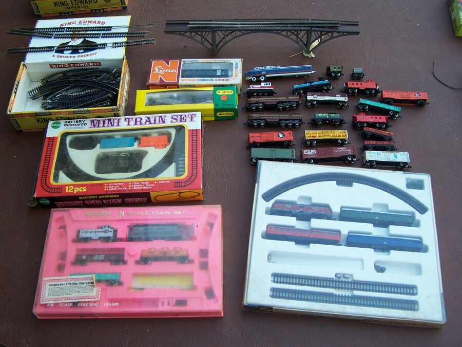 About a month ago, I visited a local Flea market, and bought a neat ball radio with 8-track player, the guy was cleaning out his house to move. Anyway, I asked if he had any trains, and he did. I just went to see what he had today, and he had both HO and N gauge items. Most of the HO was Tyco, which I told him wasn't very collectible. But he had Aurora N gauge accessories, a Rapido German N gauge set in plastic box, a Bachmann N gauge set in plastic box, missing engine, a cigar box of loose N gauge, cigar box of N track, and misc. With the German Rapido set, I offered him $100 for the box lot, and he said yes. He also had some R/C airplanes, and vintage plastic airplane kits, some static, some useable for R/C as well. I only took pics of what I bought, though. The guy has a neat history, he grew up in Germany, his Dad had a collection of Hitler books from the '30's, an SS helmet ( AUTHENTIC ), several other German military hats, etc, and photos. He's got black and white photos of Dachau, the Jewish concentration camp. Wow. Right after the war, or some years after. Pretty interesting family history! Anyway, I got some of it, some B&W photos of old German cars, German sites,etc. He was throwing out hundreds of duplicates. But, continuing on, here's some pics of what I got for my $170 today, $100 for trains, $70 for the two R/C gas airplane engines. Thought I did ok.