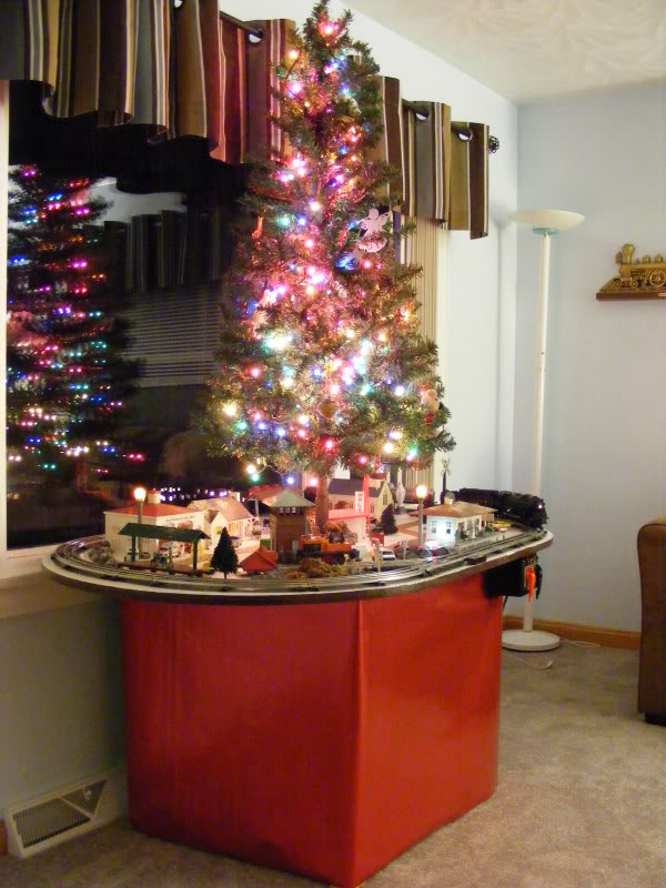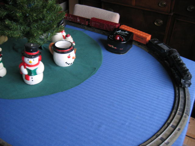 Hello Eveyone, Tis the season for Christmas displays! We set up our first real Christmas tree the other night,and of course it has to have a train running under it. This year we set the tree up on the dining room table,protected by a custom cut (by me) cardboard cover,and that was covered with a holiday tablecloth. After that the fun began,I decided to use my Marklin trains on this display because it has sharp curves,and I can fit a lot of track on the table. I have set up 2 loops of track connected by a pair of switches,and one siding with a bumper post for freight car storage. It's good to get these old Marklin trains running again as they haven't been run in a few years. Please feel free to post photos,or a description of your own holiday display no matter what kind of trains you are running.