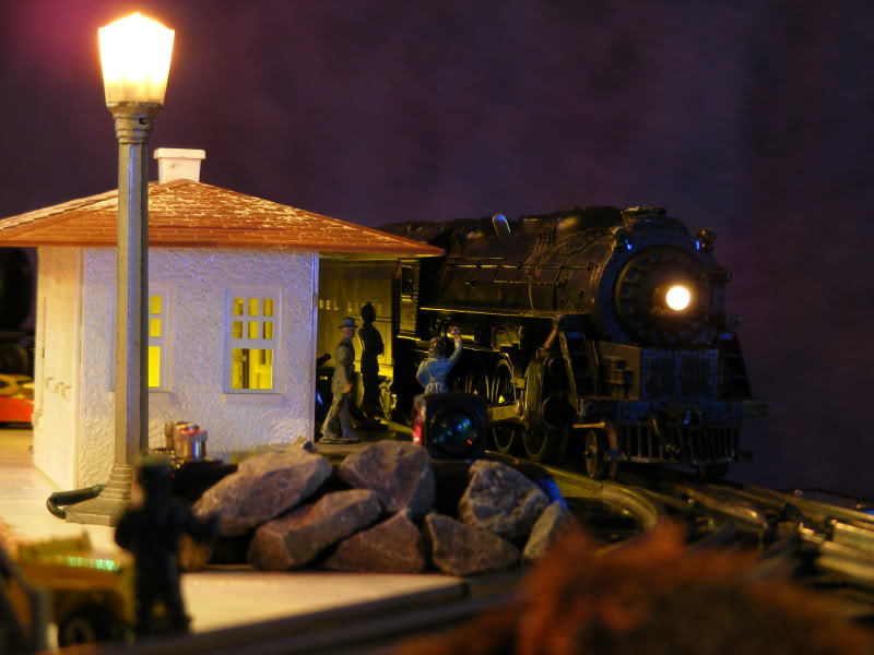 I stripped the grass paper off it, which was glued on and a total pain to get rid of. Painted the whole thing some white house I had laying around. Then covered with a coat of some metallic white acrylic paint to give it a shimmery effect. The lamps & crossing bell were all original pieces from long ago so I wired all of the back up.