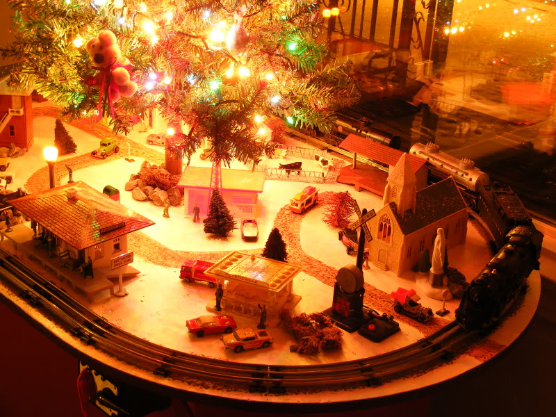 I'm multi-scale and out-of-scale as always. Here's our simple setup with a Lionel set I got at Target on super clearance last year, and my daughter's Athearn Chessie running around the tree. The village stuff came from my Mom's endless auction purchasing and Christmas obsession.