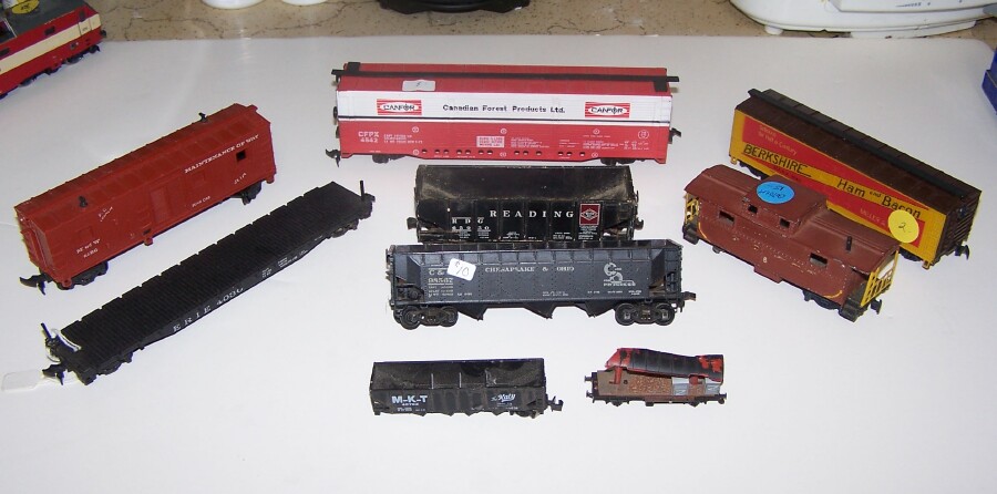 Here's all the misc. cars I got. Some metal, some plastic, some a mix. The hoppers I can't ID yet.