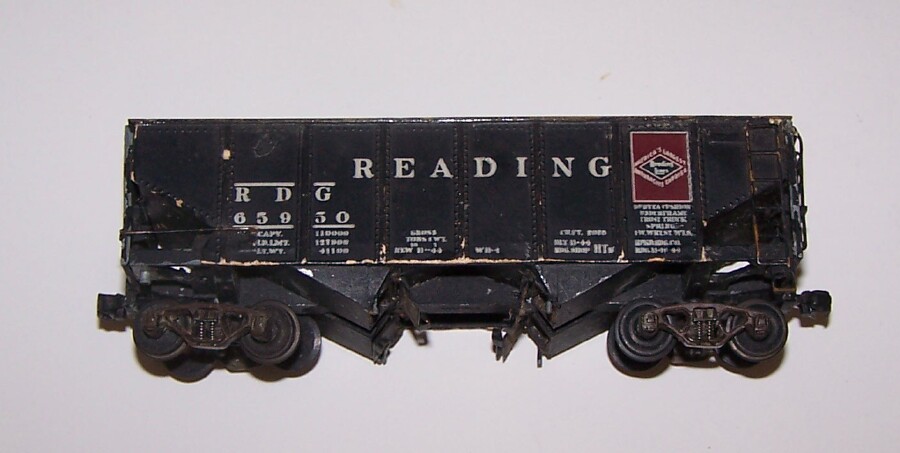 This Reading hopper has metal bottom and ends, but detailed cardboard sides. Has opening doors, but rather crude. No idea of maker, anyone ID it?