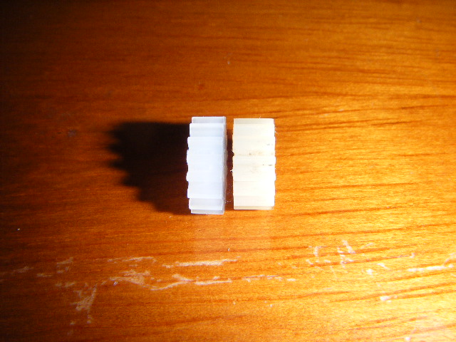 The new gear is a little larger in diameter, not quite as wide and the hole for the axle is slightly larger. Now, I hate to admit that I did this, but it worked. I used the Ernst Gear Kit method of enlarging the axle diameter by wrapping a small piece of Scotch tape around it. The new gear fits ... so far, so good.