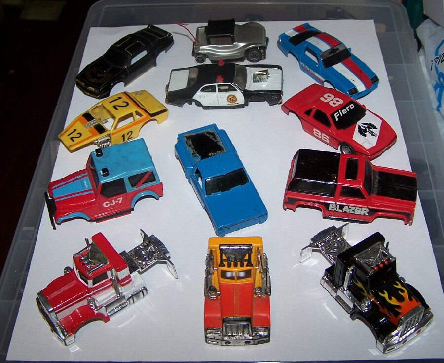 While organizing today, I decided to look at part of my collection of slot cars. These were all designated keepers, most of these are just bodies I bought in a lot some years ago. But they're all Tyco, some US-1 Trucking, the rest Tyco cars and trucks.