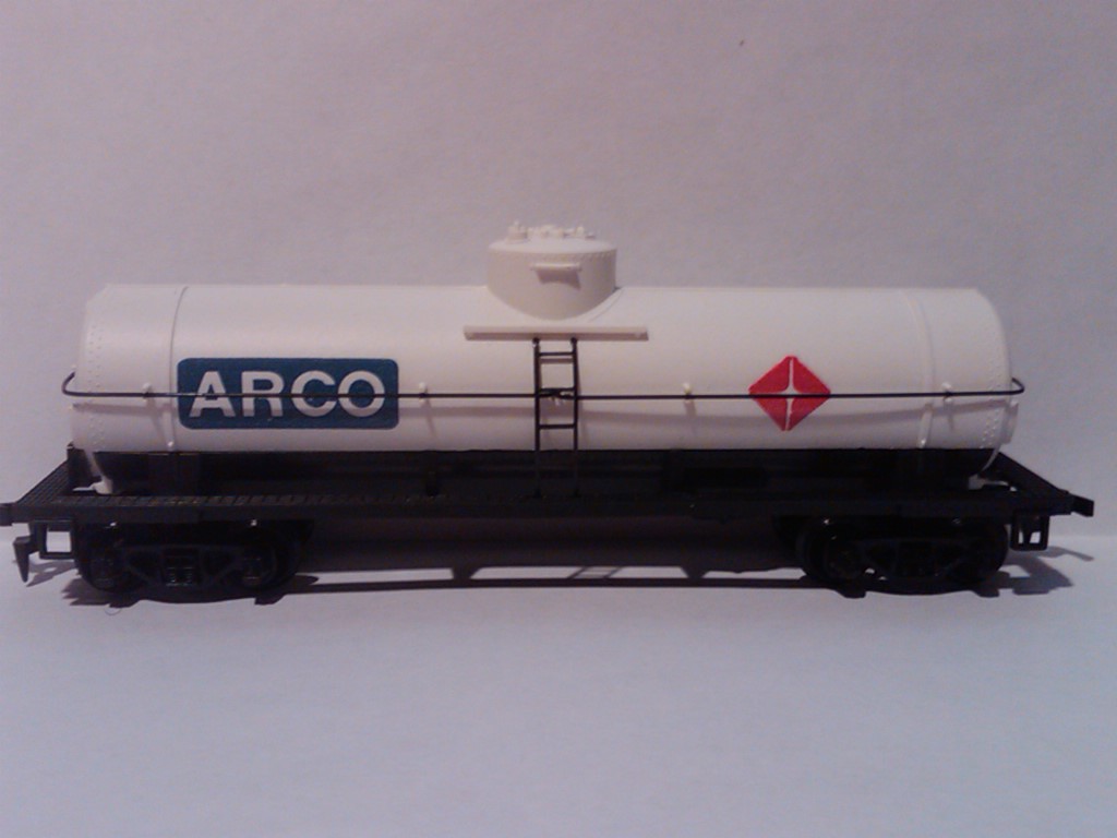 Been away for awhile, but a friend of mine picked up a couple of Tyco trains at an estate sale that he thought I would like. Turns out he found something very interesting to me. At first I thought it was just the usual common stuff, but then I realized that the Arco tanker is gray, not white. This one is pure white like the Union 76 single dome tanker, but with the Arco logos, no road markings or numbers though. Definitely Tyco, original box, tooling all matches. Photo not great, but it is white.