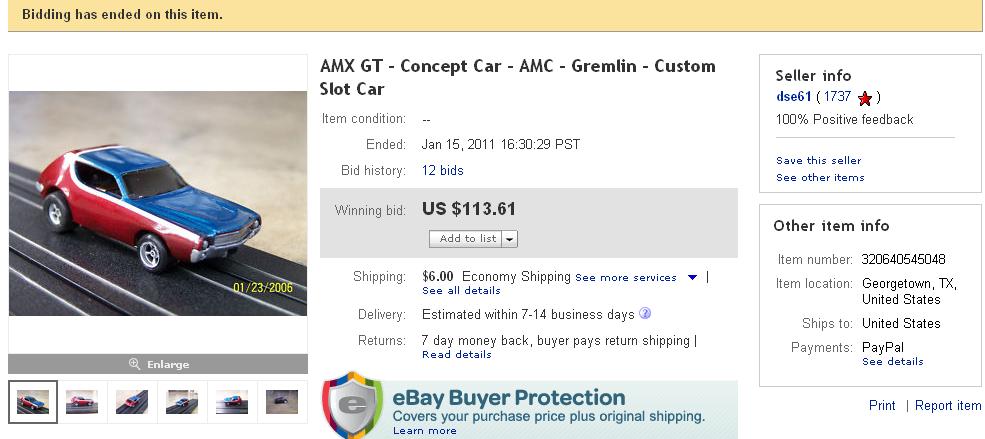 Bidding ended on this sweet customized slot car body this weekend. I'd have LOVED to own it ( both the slot car and the real prototype that once existed ). It was a concept show car AMC had in the '60's, the AMX/GT was the predecessor to the Gremlin in rear styling, but with the AMX front end.