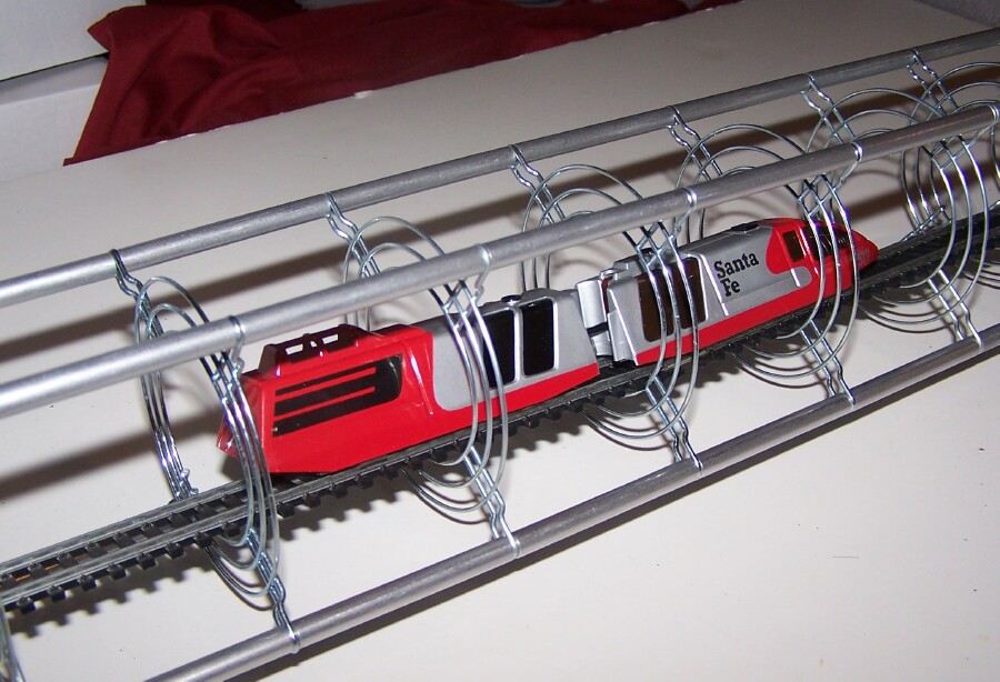 The problem with that is it takes up too much of the inner circle space vertically. Or, you meant that to REPLACE my hi-tech tube railway? No, T's have been done, I want Tube. There's only about 1/4 inch or less clearance between the top hoop and the TT roof with just the track itself. So the roadbed is going to have to sit down as low as possible in the inner circle to clear. I figured a slice of a 2" diameter wooden pole would work perfect, if the slice is JUST the right size to hold the track width-wise, and not be too high. But I haven't found anything like a side slice of a cylindrical piece of wood to use yet. Or metal. Or plastic. That's FLAT on top for the railbed. A T-shape wouldn't be shallow enough, unless the trunk in truncated enough in the middle. I'll keep looking. I don't even know what to CALL the shape that's a third of a side of a cylinder side. Moon?