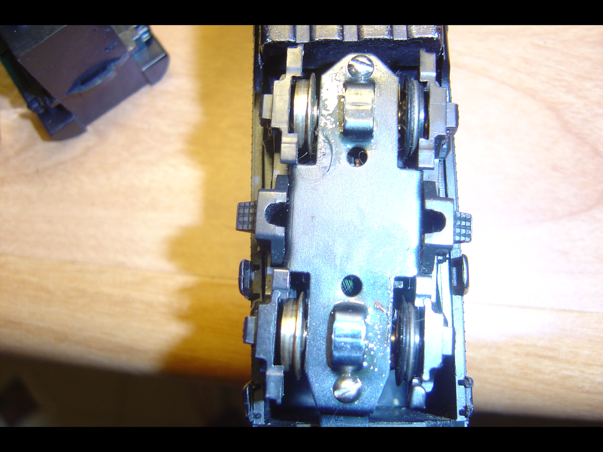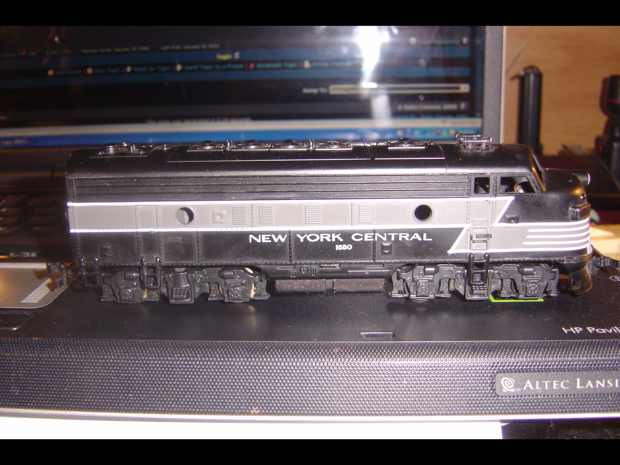 That's the former "Tyco" F-unit, as remade and sold by the "New Mantua" sometime after 1978, in the USA. It was one of the assets the Tyler family bought back from Tyco, and the blankout on the weight covers the "by Tyco" text. New York Central was a new roadname in this release, never before available. The non-flush stirrups certify this is a reworked version of the classic Tyco shell. It also features the revised, serviceable version of the MU-2 motor: fastened together with screws instead of rivets, you'll be thankful if you run it much.