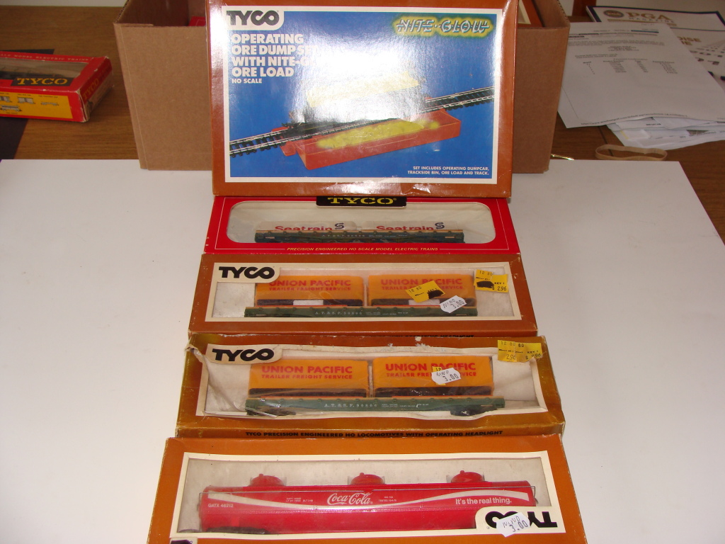 Went to the Amherst Rail Show in Springfield, MA on Saturday and The White Plains, NY show on Sunday. I would have to believe the show in Springfield has to be the biggest show in the US? It has now expanded into 5 big buildings! Lots of boxed Tyco at both shows, funny how prices very from one dealer to another. Best deal of the weekend was the 4 Matchbox racers for $20.00 as they go for around $30.00 each on Ebay. The rest of the Matchbox $3.00 each. Best deal I passed on and wish now I didn't was unboxed Lifel-Like Burlington Black/Grey Switcher and GP9 for $30.00 each. The Rio Grande Passengers went for $17.00 each, the Rio Engine new in box $20.00, the Sohio $7.00, the nite glow and other assc $5.00 each and all other cars $3.00 each. The Coke car is a great example of price differences as I bought mine for $3.00 but saw other dealers have it for $12-25. Couple Superman cars were going for over $50.00. Are they scarce