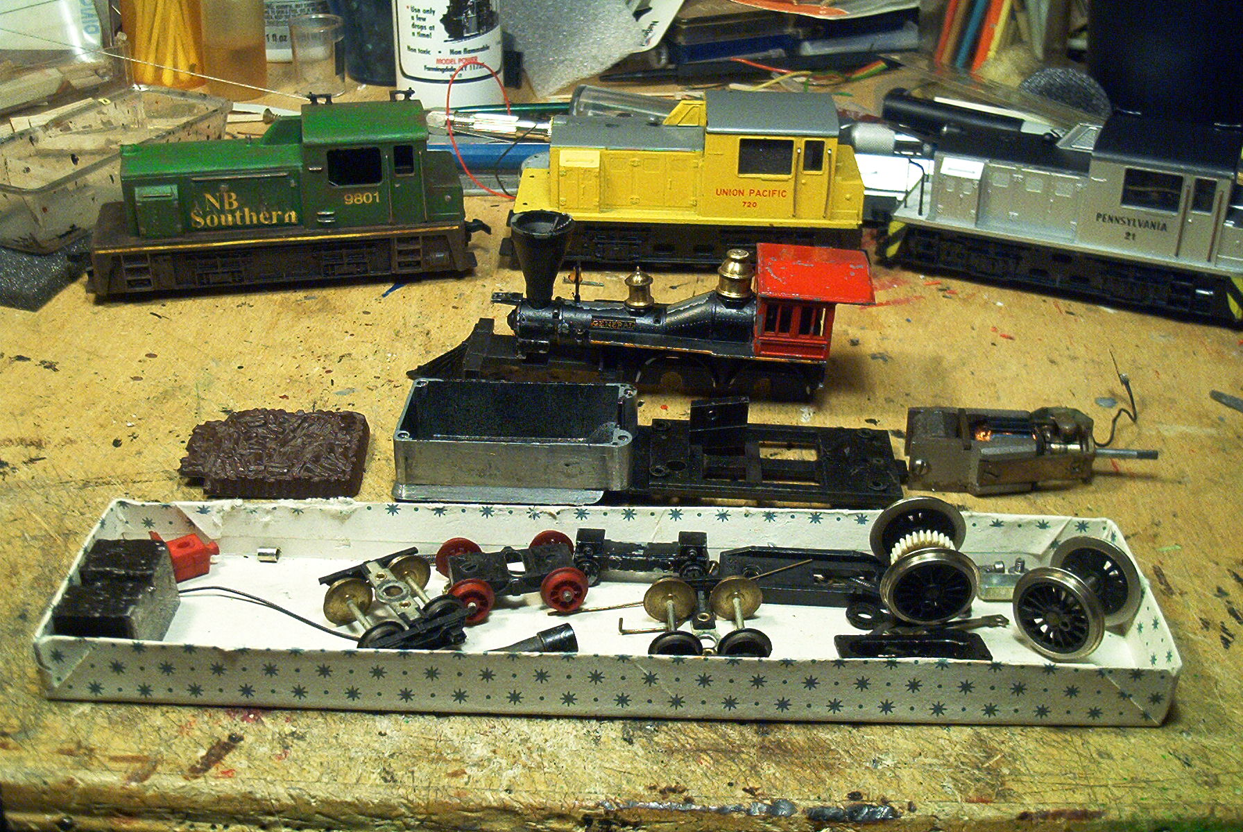 This is my one and only General. I took this guy apart and got it as clean as I could, it was gunked up a bit and just wreaked of petroleum, proabably a WD40 overdose victim. These buggers are solid. It runs well and has good weight for it's size. I was surprised to find that common pittman motor inside the tender, only in a transverse mount. That's the same motor used in the mikados and pacifics.