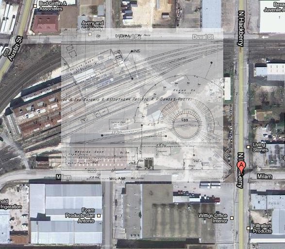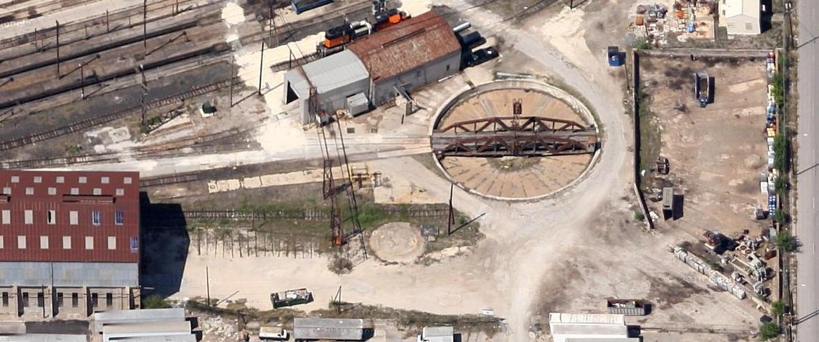 A few months ago, I was driving around San Antonio, just getting familiar with my new surroundings. From the highway, I thought that I had seen a turntable in a rail yard. I didn't think much about it at the time, but I decided to look into it and see what history I could uncover. So I took a look on Google's satelite photos and sure enough, there it was, an in tact turntable.