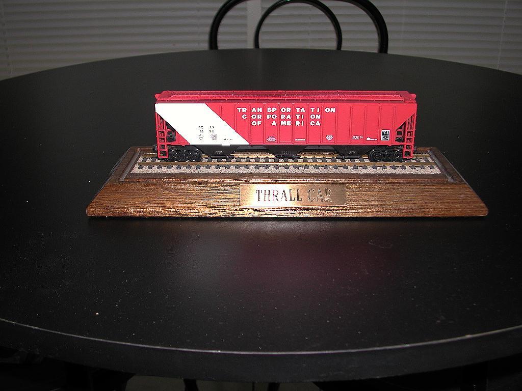 I have had this Car for over 25 years. It is a Athearn 54' Pullman Standard Covered Hopper.. It is made for The Transportation Corporation Of America. The car is mounted to a Nice Wood Display Base with a plate with "Thrall Car" engraved on it. Do not know much about it. Cannot find any Information on it... Athearn did not make this as a production run Car. Not from a set.. I have seen similar cars but, none that are exactly like this one... Could be a Special Run made by Athearn for TCA Company Execs..??? Anyway, here is the picture of it... Carl
