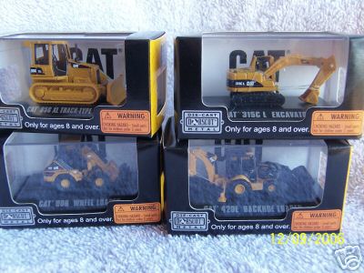 I was able to find the 2 items on the left of this picture for $1.97 each at walmart. They are very nicely made and detailed. They are die-cast and made by Norscot. I spent nearly an hour in a large clearance section and finally found these 2. They were the only cat items I found. There isn't a scale listed but they look awfully close to HO scale. Now I have to find the others.