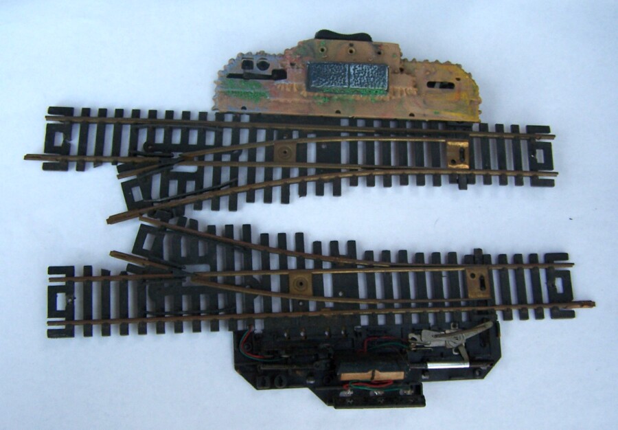 I picked these up at a Winchester, VA club train show/sale today, small but VERY good pickin's for me! Guy had a box of track and switches, 25 cents each. I got 6 pieces of Gilbert HO track, and picked up 6 steel track switches, and these two Tyco set? switches. Not sure which set they might go with, and one is missing the camoflauge , but for the price, what the hey. Any help appreciated here -