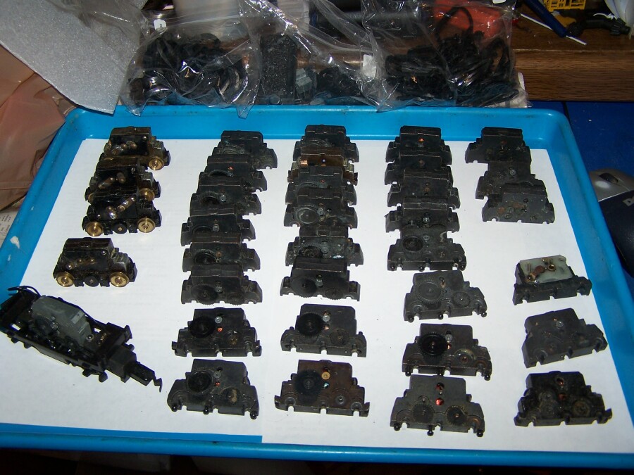 I did get one tender drive chassis and motor, so I can play with that one, and a few tender drive motors in with the regular PT motors. Half have most of the gears, the other half are missing most of the gears, but all have the armatures and plates and such. Wish more had come with axles, but they never showed up in any of the other auctions this person had. Oh well.
