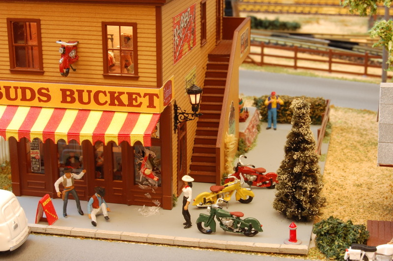 Nice scenery! Love the guys pushing the '57 Plymouth ( or is that a Desoto? ). Nice 1430 engine, I have one, but it doesn't run yet. I need to work on it. Is yours' DCC'ed ? Man, they're hefty. Great stuff there in a small area.